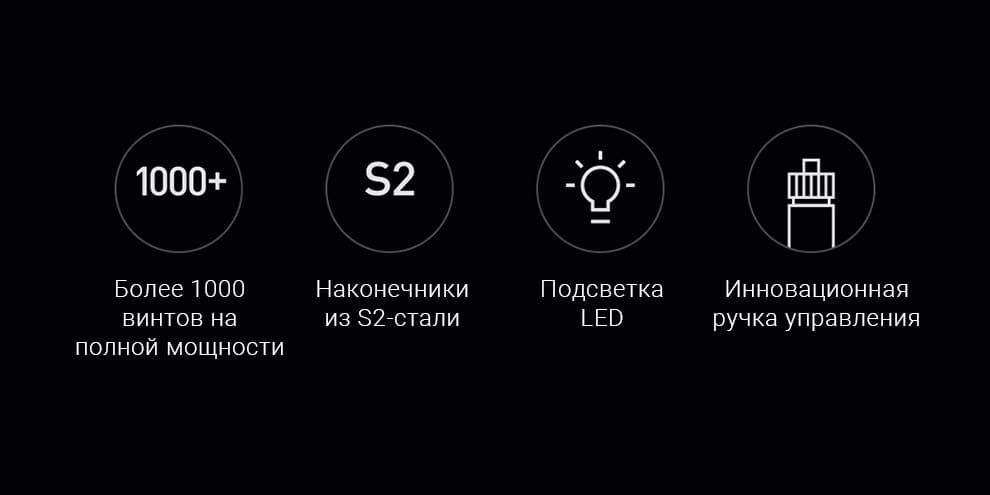 На корпусе гаджета находится кольцевой светодиод, который отключается автоматически. Он отлично помогает использовать устройство в условиях слабой освещенности. Отвертка заряжается через порт Type-C менее, чем за 150 минут.