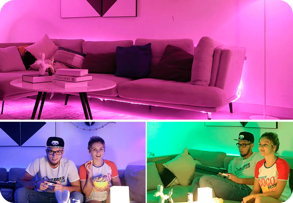 Светодиодная лента поддерживает управление через приложение и умную колонку. В приложении Вы найдете множество сценариев освещения на любой случай, от вечеринки в честь дня рождения, до романтического свидания и спокойного просмотра фильмов ночью. А голосовой помощник и умная колонка выполнят Ваши пожелания.